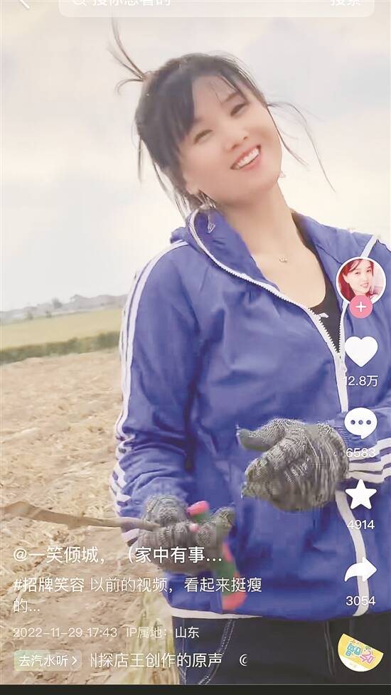 “一笑倾城”的视频有不少是自拍视角,几乎整个屏幕都洋溢着她的笑脸,就像视频聊天时,对方笑着凑到镜头前一样。“怎么不见哥哥你身影,心儿在焦急等待。”她跟着背景音乐如此唱道,还曾在评论区回复说,自己不会化妆,是抖音自带美颜。