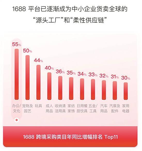 办公文化、宠物园艺、玩具用品、收纳清洁、家纺家饰、日用厨具、五金工具、汽车配件、家用电器……1688上的中国制造已变成全球爆款的“大后方”,是很多跨境卖家最主要的货源之一。据1688平台测算:今年1-5月,1688跨境买家数同比增长47%,过去一年1688的GMV(商品交易总额)里有四分之一来自跨境交易。被跨境卖家称为“中国电商的源头货盘”,1688上活跃着570万跨境采购商,越来越多的外贸工厂正通过1688的跨境供应链,直连海外日益增长的中小型采购需求。