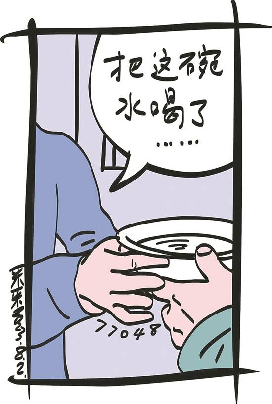 彩票店老板递来一碗水,让老李喝下。大牛想陪老李去医院检查下,老李说:“不用,我知道是怎么回事,估计是这几天献血献太多了。”
