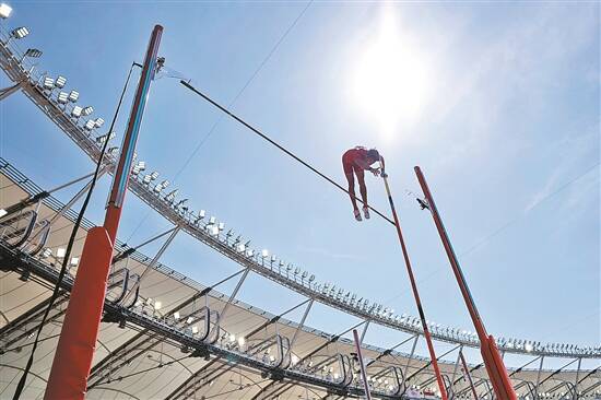 在布达佩斯田径世锦赛男子撑竿跳高比赛中的黄博凯 新华社发