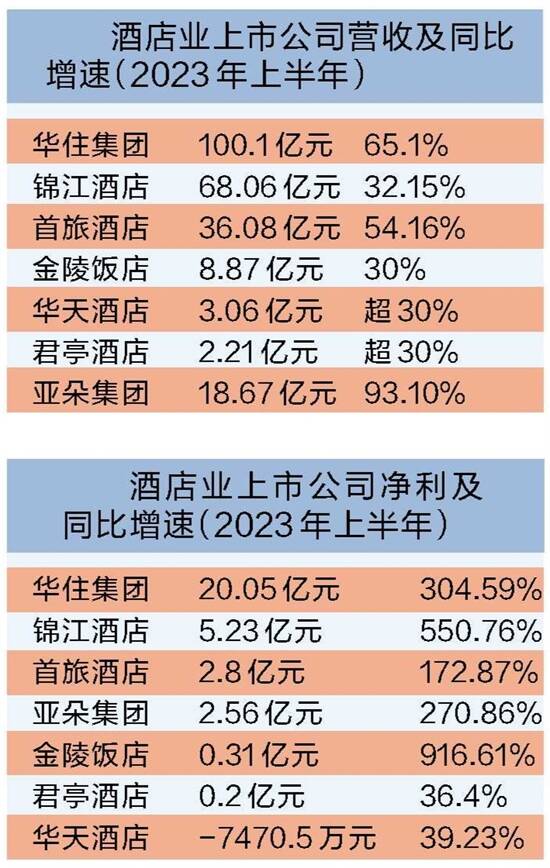 根据iFinD上的中证四级行业分类,在A股上市的国内酒店企业共有5家,分别为华天酒店、君亭酒店、首旅酒店、锦江酒店、金陵饭店,亚朵集团在纳斯达克上市,华住集团在港交所、纳斯达克均已上市,目前这七家企业均已披露2023年半年报,记者梳理发现七家企业的营业收入较上年同期均呈现较大幅度的正增长。