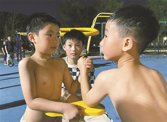 8月,江苏海门东洲公园里,两个小孩在掰手腕,比比谁的臂力大,这是留存在许多人脑海里的童年时光。