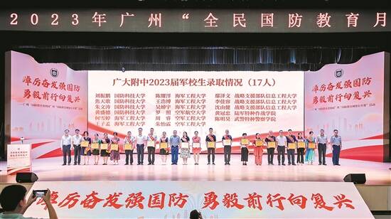 羊城晚报讯 记者李焕坤报道:9月17日,踔厉奋发强国防 勇毅前行向复兴——广州 2023“国防教育进校园”暨“国防教育网络公开课”活动,在广州大学附属中学(以下简称“广大附中”)大学城校区举行。活动当日,国防科技大学在广东开设的第一个“国防科技育英班”正式落户广大附中,旨在探索军事院校与高中学段贯通式衔接培养教育模式。