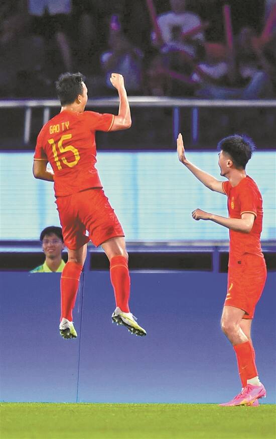 9月19日,杭州亚运会男足小组赛A组首轮,中国男足亚运队5-1胜印度队,图为15号高天意率先破门后跃起庆祝 视觉中国供图
