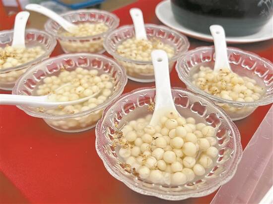 羊城晚报记者在活动现场看到,除了主会场外,芡实文化节还设有东凤特色食品展区、文化展区及“绿美东凤 魅力乡村”摄影比赛与中小学生手抄报比赛优秀作品展区。其中,食品展区共邀请18家展销商参与展销芡实美食及各类小吃,让群众可以品尝、选购到各种优质的芡实特色产品,文化展区和摄影作品展区则通过一张张精心用镜头记录的照片充分展现了东凤芡实的发展历史和深厚文化。