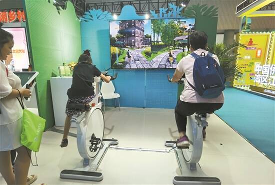 “本次旅博会的“绿美广东 休闲乡村”广东乡村旅游暨文创成果展区内,陈列了11个省级优质乡村旅游目的地的文创产品:如南平村的茶具套装、深圳市鹏城村以“武将”为元素的明信片、钥匙扣等。在展区另一端,则摆放着历年粤港澳大湾区文创设计大赛作品,比如以米仓为原型的《有粮不慌》。广东省城乡规划设计研究院文旅科技协同创新中心开发的开平碉楼能量单车体验项目更是成为观众打卡的热门项目,通过自行车和三维场景结合,提供多感官的逼真模拟,提升游客的沉浸式体验感,助力乡村旅游智慧化发展。