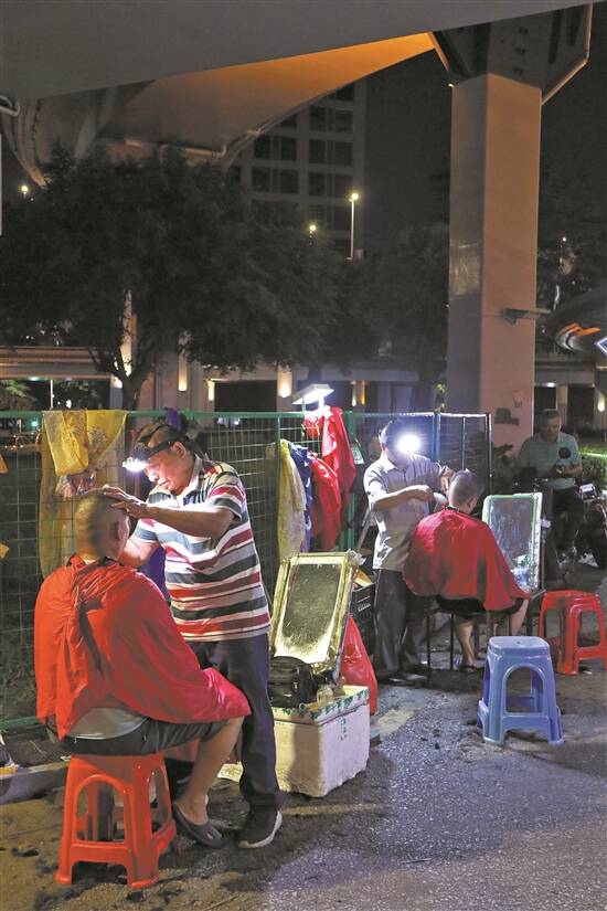 这些街边理发师,大多早上6时就开始摆摊,白天靠小招牌和人声招揽顾客;傍晚时,每个小摊支起一盏小灯,一路排开,场面有些壮观;到晚上10时许,理发师们才开始陆陆续续收摊。