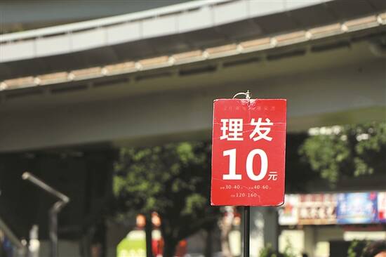 “十元理发”的招牌在阳光下格外醒目