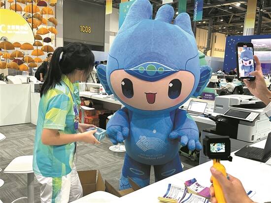 在这里,还能时不时偶遇亚运吉祥物“三小只”(宸宸、琮琮、莲莲)和现场的人员进行互动。他们还会给志愿者递上精心准备的礼物,让现场的氛围变得热闹起来。