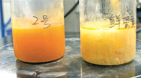 实验室用生鲜咸鸭蛋取蛋黄检测对照,发现生鲜咸蛋黄中每100克样品中淀粉含量为0.2克。秦应昌介绍,除了2号外的其他5个样品没有检测出添加剂,“经过对比实验判断应该是真的蛋黄。”而2号样品不是真正的蛋黄,是改变了物理性状的蛋制品。