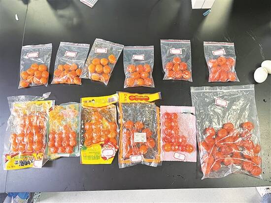 针对6个样品,实验室进行了防腐剂、食品色素、苏丹红以及淀粉等指标的检测。结果显示,2号样品检出每100克中山梨酸钾含量为0.0724克、淀粉含量为39.8克。其余5个样品则均未检测出添加剂,每100克样品中淀粉含量为0.08克-0.46克。