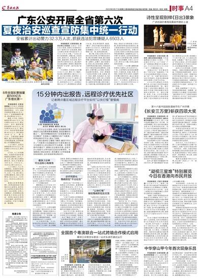 羊城晚报讯 记者张璐瑶、通讯员粤公宣报道:记者从广东省公安厅获悉,按照公安部和省公安厅“夏季行动”总体部署,确保人民群众欢度中秋国庆佳节,9月22日至24日晚,广东省公安机关统筹指挥、全警出战,在夜间巡查、清查打击、水域夜查、设卡查缉、通道查控、快反处置、集中宣防等方面同步出击,通过提升社会面见警率、管事率、精准率吹响南粤“平安哨”,筑牢安保“防护墙”。