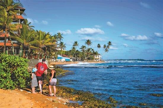 在黑卡杜瓦沙滩上,一家人正在享受着美好的假期