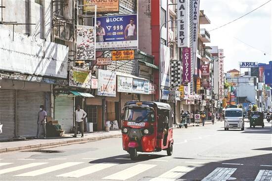 斯里兰卡首都科伦坡的街头景象,行驶在马路中间的为当地的特色出行工具突突车