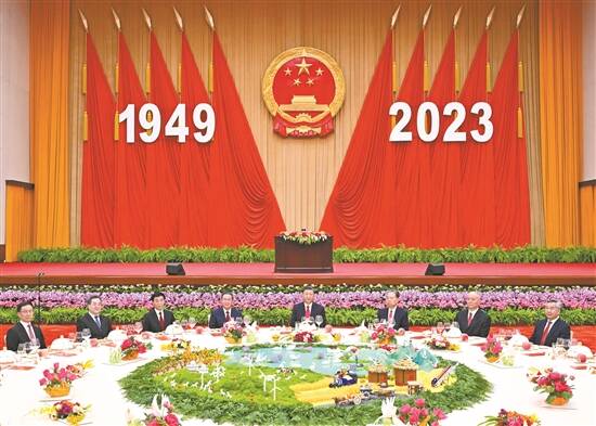 人民大会堂宴会厅华灯璀璨、鲜花绽放,洋溢着喜庆热烈的节日氛围。主席台上方高悬着庄严的国徽,“1949-2023”大字年号在鲜艳的红旗映衬下格外醒目。