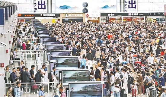 28日上午八九时开始,乐广、广清等高速车流量逐渐增大,地图路况飘“红”。当日下午,高速公路、火车站及市区热点路段等出行流量强劲增长,上演车海人海大片。