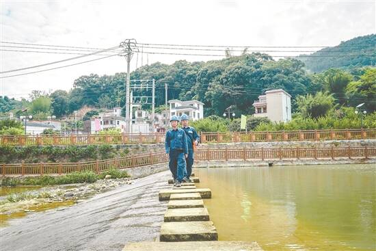 南方电网广东揭阳揭西供电局良田供电所运维人员到辖区内的乡村沿路开展线路、设备巡视检查,确保乡村居民的安全用电 林宇 摄