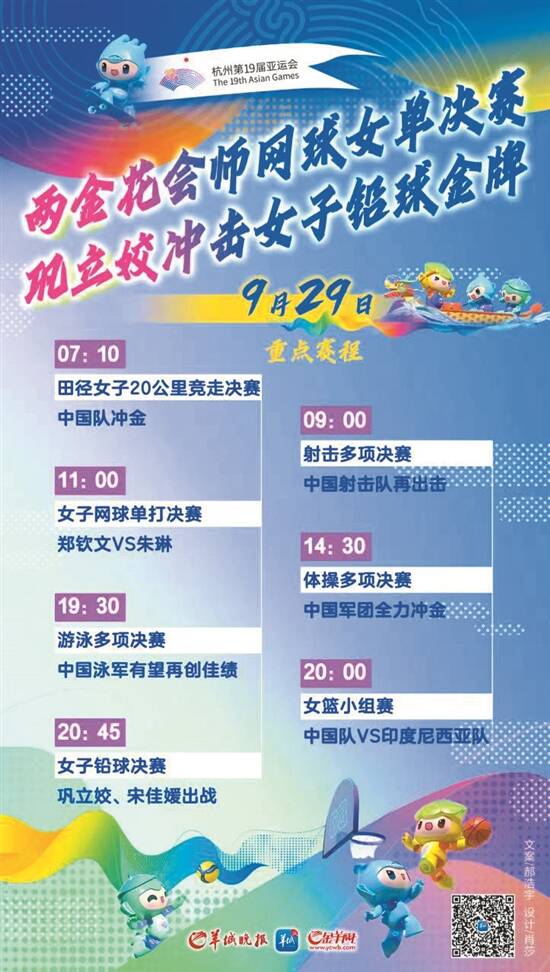 9月29日是杭州亚运会开幕后的第六个正式比赛日。当天将产生33块金牌,其中游泳、体操、击剑等项目将决出最后几枚金牌的归属,同天田径项目将密集开赛,中国田径队的表现值得关注。此外最值得关注的项目当属网球,29日将产生女单和男双两枚金牌,中国金花郑钦文、朱琳的表现成为一大看点。