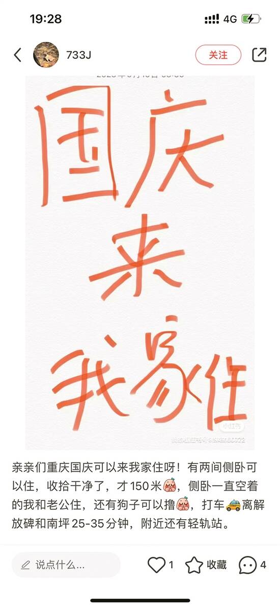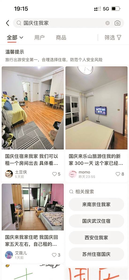 记者以“国庆住我家”为关键词在社交平台上进行搜索,发现可供短租的房源遍布各大旅游城市,包括北京、南京、广州、长沙、重庆等。许多房主表示,他们在国庆期间计划前往其他城市旅行,平时居住的住宅会空置,于是决定将其出租。