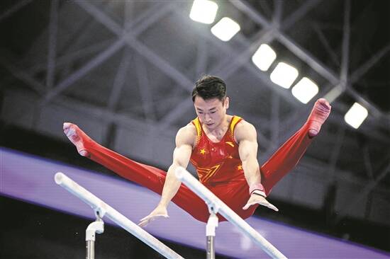 在男子双杠项目的决赛中,奥运冠军邹敬园以15.933分的成绩,毫无争议拿到这个项目的金牌,捍卫自己“双杠王”的美誉。