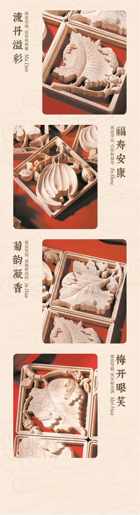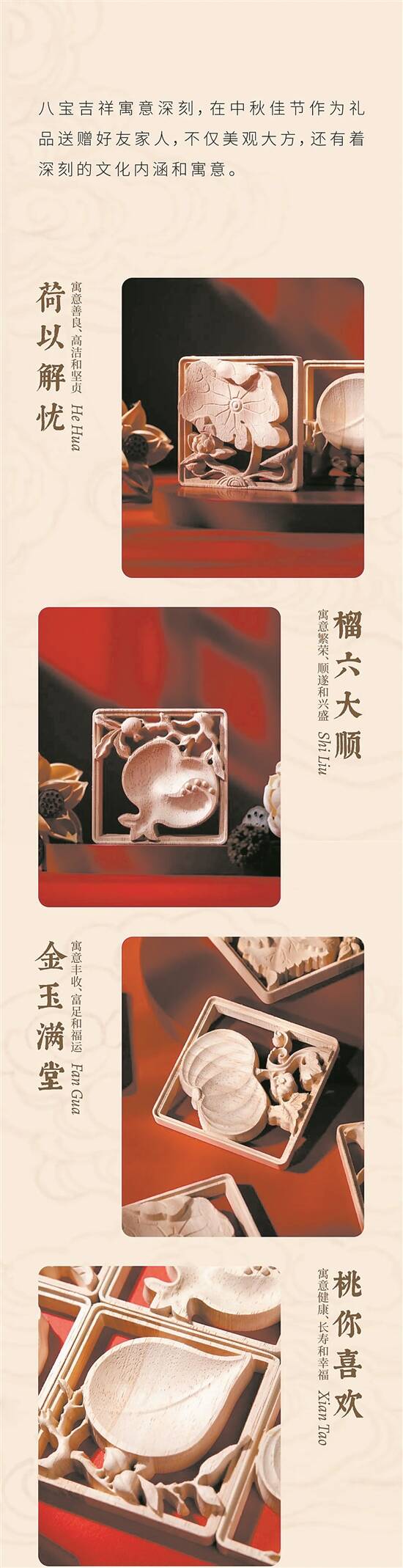 这款冰箱贴文创产品,设计灵感来源于金漆木雕人物花鸟八宝纹帖盒。
