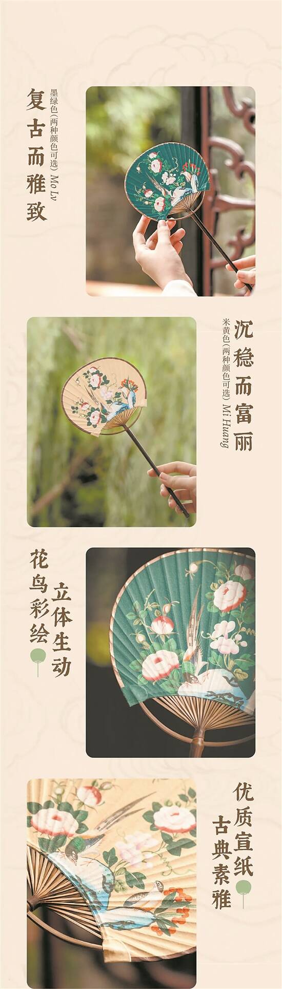 如今,花鸟团扇已成为一种十分受欢迎的工艺品,不仅可以纳凉,还很适合用于室内装饰和节日礼品赠送。