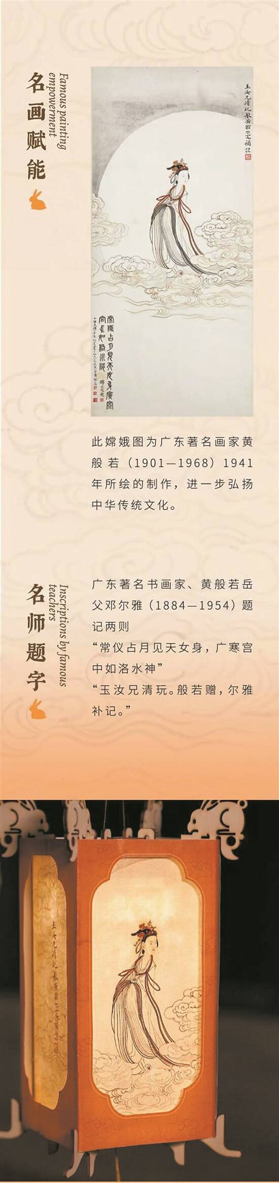 此嫦娥图为广东著名画家黄般若于1941年所绘。广东著名书画家、黄般若的岳父邓尔雅题记两则:“常仪占月见天女身,广寒宫中如洛水神”“玉汝兄清玩。般若赠,尔雅补记”。