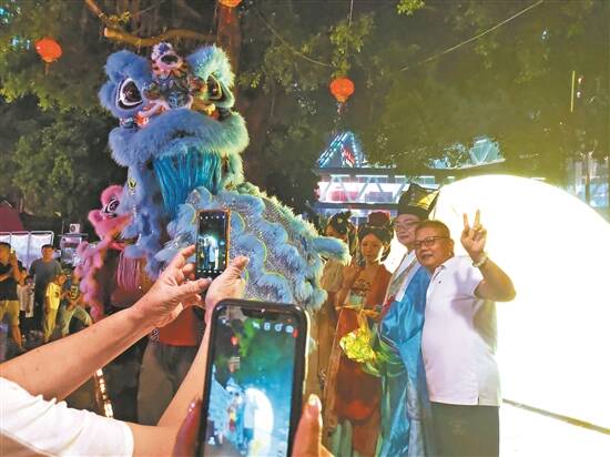 在广州海珠江南西路中秋游园会上,市民与汉服队伍合影留念 羊城晚报记者 李春炜 摄