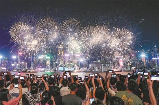 羊城晚报讯 记者王漫琪报道:10月1日晚9时,香港全城万众期待的璀璨烟花在维港上空盛情绽放。这是香港国庆烟花汇演在阔别五年之后的重新回归。