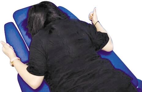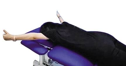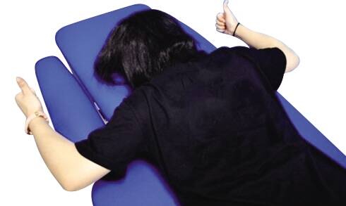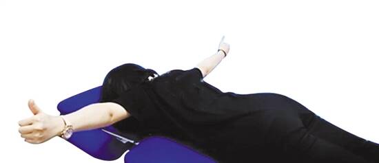 第三,继续俯卧姿势,双臂伸直,自然下垂,手指呈“点赞”姿势,两拇指分开指向完全相反的方向,正外方肘关节保持伸直,手臂向拇指方向运动,末端要求手臂至少达到肩关节平面,并且在末端保持1—2秒,然后缓缓放下。10次为一组。