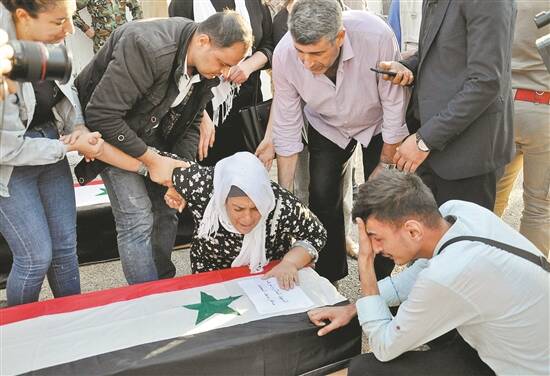 遇难者家属在霍姆斯参加亲人葬礼时哭泣 新华社发