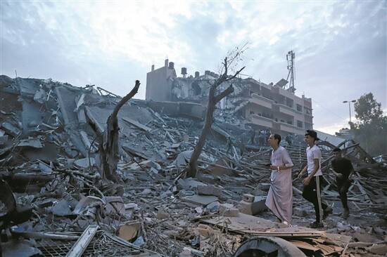 10月7日,巴勒斯坦民众在加沙城查看以色列空袭后毁坏的民宅 新华社发