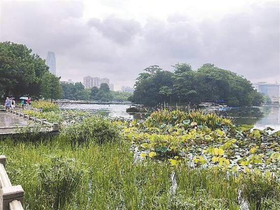 东山湖小微湿地位于越秀区东山湖公园南部湖湾,修复规模约4900平方米。越秀区相关部门介绍,近年来,依托东山湖现有小微湿地本底,工作人员结合地形新增雨水花园与生物沟、生物洼地、下凹式绿地等水敏性结构区域,发挥小微湿地雨洪调蓄、生态补水的“城市海绵”效应,“既能够优化提升原有滨水绿地系统,又能有效缓解城市内涝问题”。