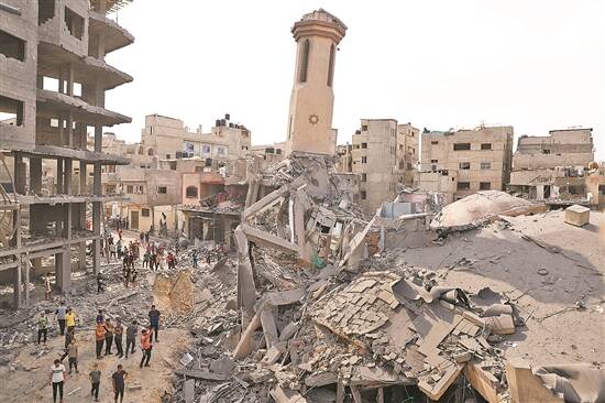 这是9日在加沙城拍摄的被以色列空袭炸毁的清真寺 新华社发