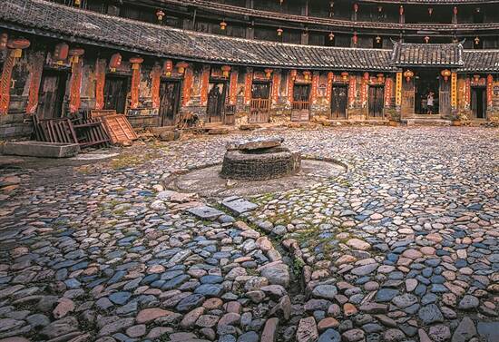 穿过过道,来到中央天井,环顾四视,一楼房屋门两侧都贴着大红色的对联,三层楼高的围楼开着数百扇门,拙朴的门户上俱挂着红色灯笼,寄托着对家庭团圆、生活美好的祝愿。层层相叠的斑驳灰瓦,顺着圆心向上拔高,鹅卵石铺就的地面已被打磨得光滑透亮。天井中还有一口石井,圆形的井口布满着青苔水痕,透过破损的井盖向下看去,幽深的井水倒映着悠悠白云。