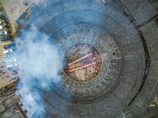 每年正月初三,村民都会聚集在花萼楼中庆祝祈福,届时,天井中将摆起两排八仙桌,载满鸡鸭、酒水、发粄、水果……花萼楼内彩旗招展、香雾缭绕,在鞭炮声、锣鼓声中,人们共同祈求新的一年万事如意、阖家幸福。