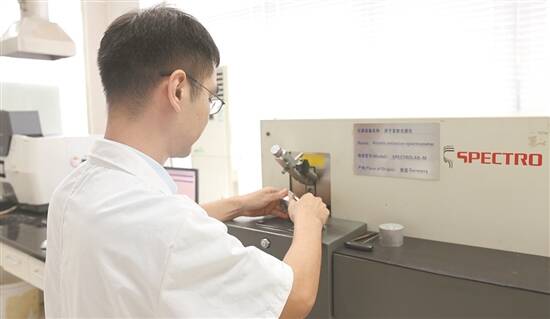 在兴发铝业理化检测中心,科研人员利用光谱仪检测产品成分