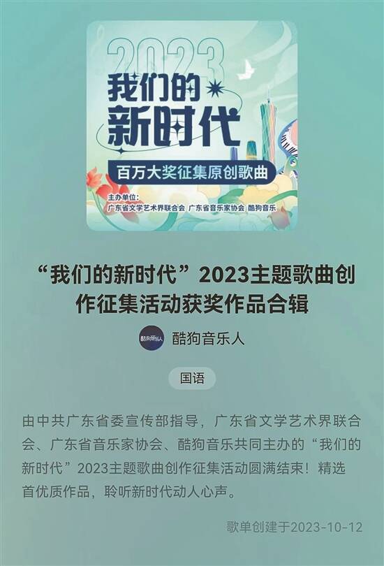 10月12日,由中共广东省委宣传部指导,广东省文学艺术界联合会、广东省音乐家协会、酷狗音乐共同举办的“我们的新时代”2023主题歌曲创作征集活动落下帷幕。历时两个月的征集和选拔,评审团在15031首投稿作品中选出30首,《一路生花》等10首精品原创歌曲、《梦想的远征》等10首优秀歌曲、《假如让我再次选择》等10首入围歌曲成为本届获奖作品。