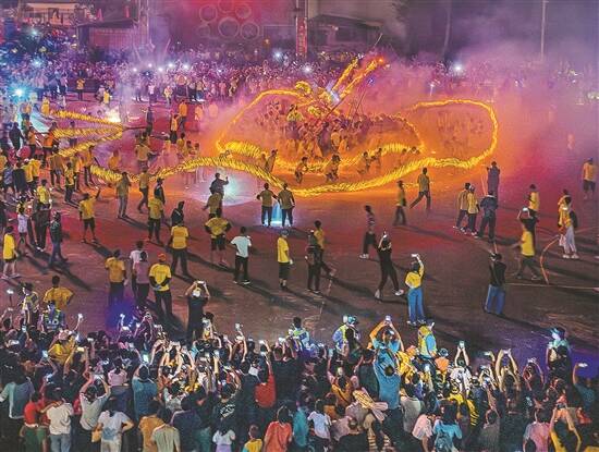 浩浩荡荡的人群同“火龙”一起,穿行在村社中,走过池塘、经过菜园,穿街过巷,沿途爆竹声声,如雷声阵阵,驱赶着清凉的夜色,把丰收的喜悦和祝福送到家家户户。