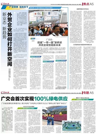 广交会开幕前,广东电网、广州电力交易中心和广东电力交易中心积极促成中国对外贸易中心分别与中广核新能源、广东电网能源投资公司达成1200万千瓦时的绿色电力合作协议,实现广交会首次100%绿电供应。