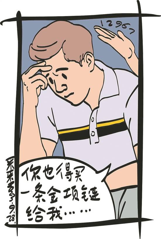 回家后,丹凤越想越不服气,她对老公大林说:“你也得买一条金项链给我不可,而且还得比小丽的贵,比人家的粗。”