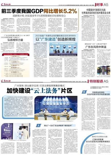 广州互联网法院、海珠区法院在琶洲法律集聚区公共法律服务中心设置了自助诉服一体机、“E法亭”等5部智能设备,可完成在线调解、在线庭审等诉讼服务功能。广州仲裁委设置“云小仲”智能仲裁机器人,可协助当事人在线立案、进行智能咨询……