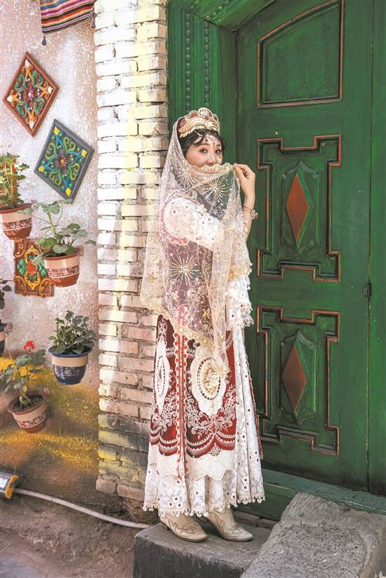 身穿新疆特色服饰的游客在喀什古城内拍照