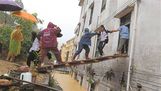 “必须想尽一切办法转移学生!”新榕中学校长当机立断,打破学生宿舍二楼窗户,组织教职工向周边村民借来木梯,并把宿舍的床板拼接起来,与木梯钉在一起,变成长梯,全体老师手拉手,与木梯、床板共同搭起“人桥”,周边100多名村民也纷纷投身到救援中,70多岁的老伯主动提供工具,临街商户帮忙搭桥,大家纷纷加入“牵手”行列,仅用了半小时,350多名学生全部被安全转移。