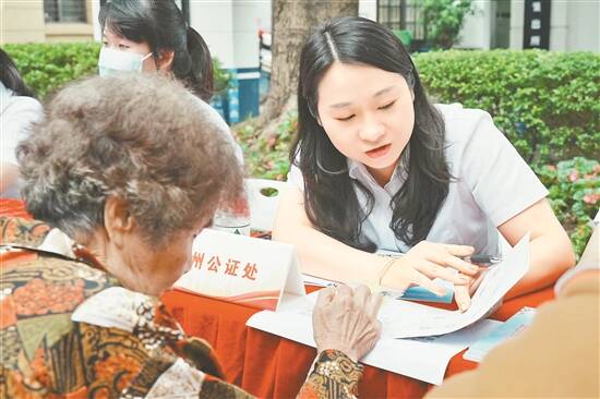 “我的老伴儿已经走了,现在名下有一些存款和一处房产,想公平地留给两个孩子,想咨询一下遗嘱公证。”摊位前,年过八旬的黄阿婆向公证员诉说着自己遇到的问题,公证员当即为阿婆提供了明晰的指引。咨询结束后,黄阿婆一遍遍竖起大拇指,向公证员表达感谢:“我们年纪大,腿脚不方便,如今在社区就能进行咨询、预受理,这样的服务很贴心。”