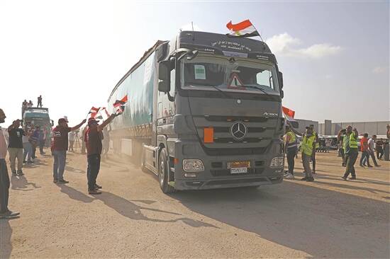 10月22日,在拉法口岸埃及一侧,载有人道救援物资的货车准备通过拉法口岸前往加沙地带 新华社发