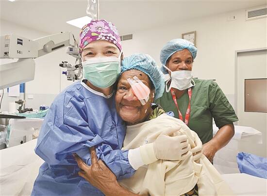 2018年,斐济,患者接受白内障手术后与陈伟蓉(左)相拥