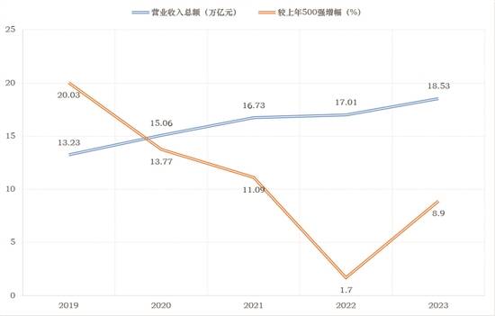 记者注意到,面对不确定性日益加剧的国际环境以及国内疫情管控的压力,2023广东企业500强营业收入仍保持着高质量增长态势,营收合计达到18.53万亿元,首次突破18万亿元,比上年500强企业营收增加1.52万亿元,同比增长8.9%,呈加速提升态势,打破近五年增幅减缓局面,企业入围门槛也持续上升至29.17亿元。