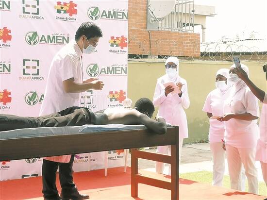 剧烈腰疼得无法直立的加纳当地人,经过队员袁锋半小时的针灸,首次治疗就恢复正常;队员刘晨柳用雷火灸,为女性患者缓解腹部疼痛;在加纳最大的传统医学医院,非洲朋友都跟着医疗队员学起了八段锦……中医特色疗法展现出的“神奇疗效”,在加纳实力“圈粉”。