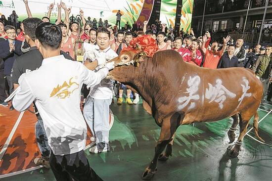 本届“村BA”总决赛的礼品也非常特别,赢得冠军的中山沙溪队不仅获得了奖杯和证书,戴上了当地极具特色的银帽,还将一头关岭黄牛牵回了家。